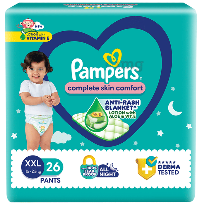 New Pampers complete skin comfort pants have ANTI-RASH* lotion with vitamin E & aloe vera, to keep your baby’s skin protected. Newborn baby diapers containing Lotion with Vitamin E & Aloe vera helps protect your baby’s delicate skin from diaper rash and irritation. Best diapers with Ultra Absorb Core, provides your baby a new type of dryness overnight - breathable dryness. Magic gel locks wetness away to provide up to 12 hours of dryness. The new and improved product design enables a comfortable fit, closer to the baby’s body and a flexible waist band that adapts to baby’s movements for a comfortable fit. Available in all sizes – Small diapers, medium diaper pants, large size diaper pants, xl diapers, xxl diapers, xxxl diaper pants. A top layer with cotton-like soft material ensure a comfortable night’s sleep. Our pants with fun exterior graphics, fun designs and characters ensure you enjoy with your baby. *Helps prevent rash due to wetness after 1 day of usage, based on clinical studies in USA 2000-2019.