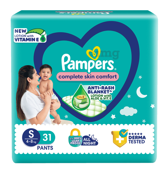 Pampers Complete Skin Comfort Pants Anti-Rash Blanket Small Lotion with Aloe Vera are designed to provide anti-rash protection with their Anti-Rash Blanket feature. They come with lotion containing Aloe Vera and Vitamin E, ensuring complete skin comfort for babies. The diaper pants are leak-proof and keep babies dry all night.