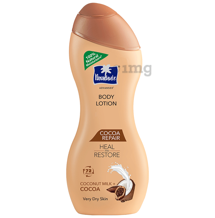 Parachute Advansed Body Lotion Cocoa Repair is enriched with the goodness of pure coconut milk and cocoa butter, which can help to deliver intensive moisturisation even in harsh winters. This formula with goodness of coconut milk and cocoa butter can help to intensively moisturises, nourishes and protects your skin. The formula is crafted especially to provide long lasting moisturisation and may help repair dry skin even during harsh winters. Crafted with natural moisturisers, it is designed to support moisture retention and help restore suppleness. The creamy texture spreads effortlessly, absorbs quickly, and may form a moisture barrier that lasts throughout the day without making the skin greasy. This formula is free from sulphates, mineral oil, and phthalates, making it a thoughtful choice for those who prefer gentle skin nourishment. Ideal for extremely dry/very dry skin, suitable for use by both men and women. Use regularly to have a deeply nourished and moisturised skin.