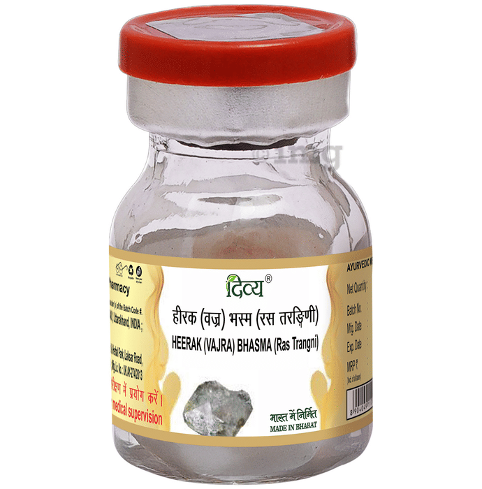 Divya Heerak Bhasma contains Heera Churna, Kulthi, Ras Sindoor, Suddh Mainsail and Suddh Gandhak as a combination of the ingredients.