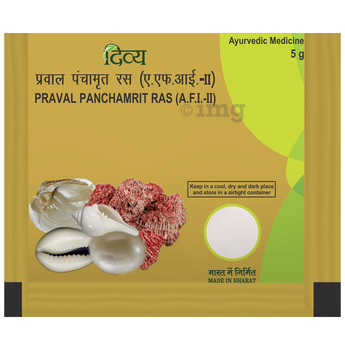Divya Praval Panchamrit Ras contains Praval Bhasma, Moti Pishti, ShankhBhasma, Mukta Shukti Bhasma, Kaudi Bhasma and Aak Dugdha as a combination of ingredients