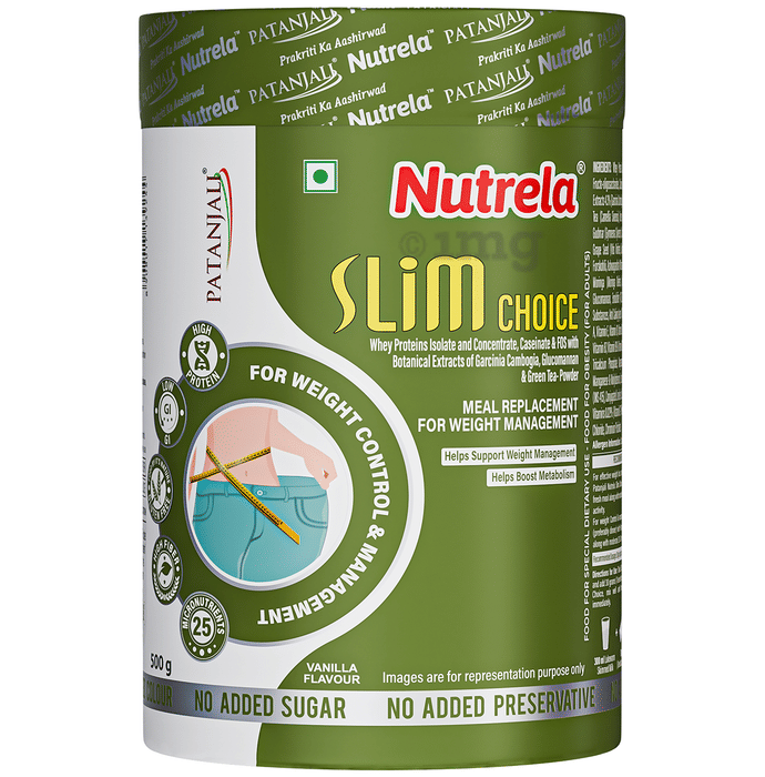 Patanjali Nutrela Slim Choice Powder is a meal replacement which contains whey protein, bio-fermented vitamins and permitted botanical extract. It contains bio-fermented vitamins and 25 micronutrients. It helps manage appetite and weight management.