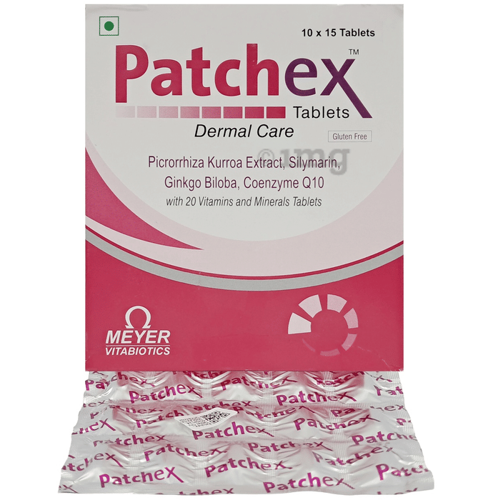 Patchex Tablet is a skin supplement containing vital antioxidants, vitamins, and minerals to manage various skin conditions and improve skin health. Picrorrhiza kurroa extract, vitamin C, ginkgo biloba, and other antioxidants in the formula help reduce free radicals which cause oxidative damage to the skin and cause skin issues. It also protects against the harmful sun rays that cause photo-oxidative damage to the skin.