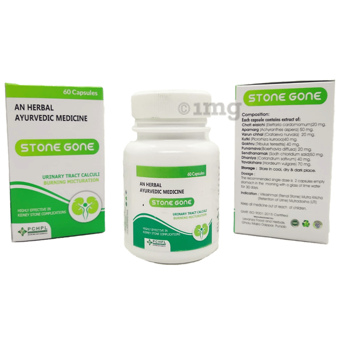 Stone Gone is a herbal ayurvedic medicine that can help manage kidney stone complications. It is a suitable formulation that can help remove kidney stones. Its ayurvedic properties can help reduce micturition, unitary tract calculi, and infection.