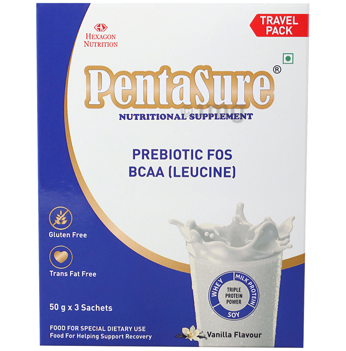 PentaSure Nutritional Supplement Prebiotic FOS BCAA -Leucine Sachet (50g Each) Gluten Free is to support everyday dietary needs. It features a blend of 3P proteins, dietary fibre (FOS), and Leucine, making it suitable for individuals seeking balanced nutritional intake. PentaSure can be included as part of a daily routine to complement a well-rounded diet.