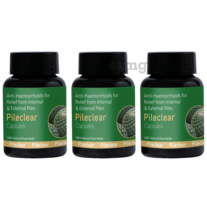 Pileclear Capsule is an anti-haemorrhoids capsule for relief from internal and external piles. It can help reduce pain, burning, and itching and possesses healing properties. It is vegetarian and safe for long-term use.