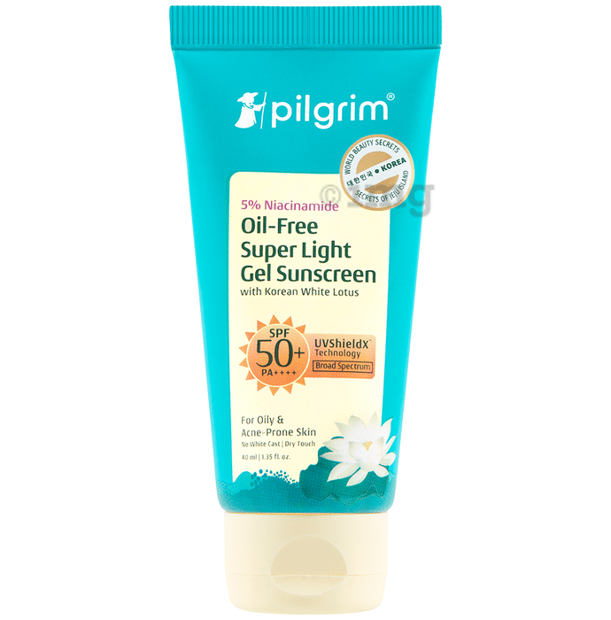 Pilgrim 5% Niacinamide Oil-Free Super Light Gel Sunscreen SPF 50+ PA++++ is a fast-absorbing sunscreen designed for oily and acne-prone skin. Enriched with Niacinamide, White Lotus, and Centella Asiatica, it offers high-level broad-spectrum protection (SPF 50+ PA++++) from UVA, UVB, and blue light, and it also targets blemishes, control oil, and soothe irritated skin. Its water-light gel texture ensures a matte finish, making it ideal for daily wear, even under makeup. A holistic blend of skin-benefiting botanicals and sun filters, this sunscreen can help defend the skin without clogging pores or causing breakouts.