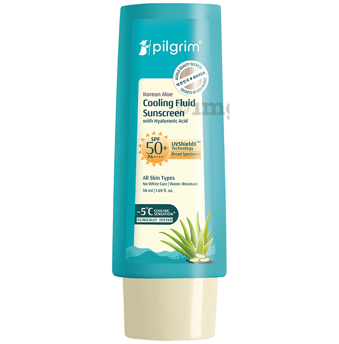 Pilgrim Korean Aloe Cooling Fluid Sunscreen with Hyaluronic Acid All Skin Types SPF 50+ PA++++ is a fast-absorbing sunscreen formulated to offer broad-spectrum support with SPF 50+ PA++++. Enriched with Korean Aloe and Hyaluronic Acid, it can help maintain hydration while delivering a refreshing cooling effect. The innovative UVShieldX™ technology may help provide protection from UVA, UVB, and blue light. Its non-sticky, lightweight formula spreads easily and is suitable for all skin types. The fluid texture creates a smooth finish without leaving any white cast, making it ideal for daily use, even in humid or outdoor settings.