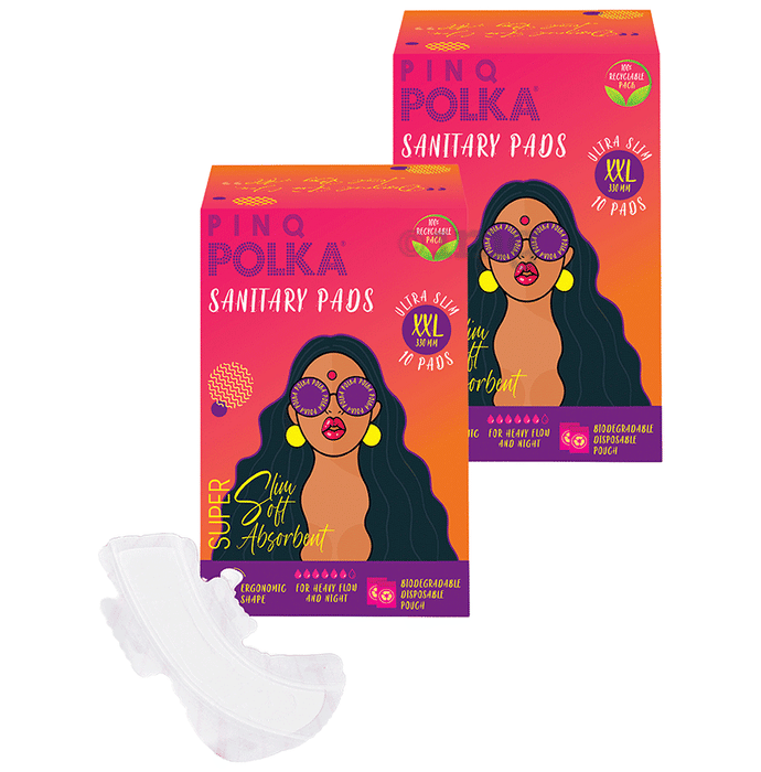 PINQ Polka Premium Cotton Feel Sanitary Pads (10 Each) Regular It's bold, playful, and makes you feel good while you are on your period. Polka brings you just the right affordable product range with premium cotton feel sanitary pads. Don't let the fear of rashes, itching & stains weigh you down! Combined with superior gel technology, pinq polka (XL size) premium soft cotton feel ultra thin rash-free sanitary pads are perfect for women on the go. These pads are free from any chemicals and are chlorine-free and bleach-free. A wider back & 5 5-way sticking mechanism provides extra comfort and keeps leaks and stains at bay.