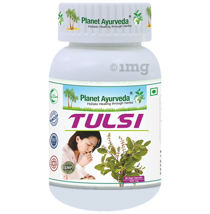 Planet Ayurveda Tulsi Capsule contains tulsi, which has medicinal properties and grows in warm and tropical regions. There are two varieties of Tulsi- Krishna tulsi and Rama Tulsi. It has antioxidant properties. It also helps to balance Vata and Kapha dosha, thus increasing pitta doshas. It also promotes digestive fire and is helpful in all skin diseases.