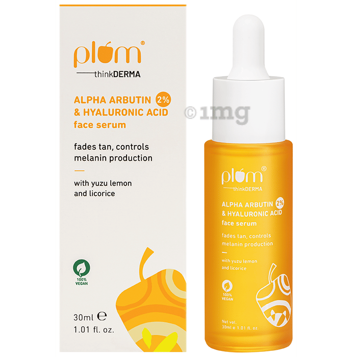 Plum 2% Alpha Arbutin & Hyaluronic Acid Face Serum is a lightweight serum that helps fade tan and control melanin production in the skin. Alpha Arbutin is a gentle active that is considered safe for all skin types, including sensitive skin. It effectively fades sun spots, diminishes the appearance of melasma i.e. darker patches on the skin and post-inflammatory hyperpigmentation. With the hydrating hyaluronic acid, it leaves the skin plump, resulting in a smoother, supple appearance. The addition of zesty yuzu lemon and licorice further brightens skin and evens out skin tone.