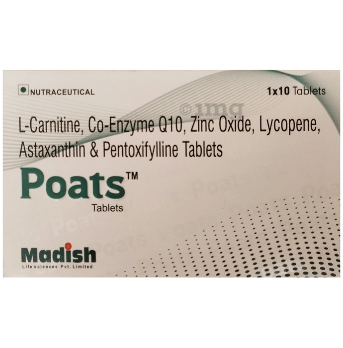 Poats Tablet is a comprehensive antioxidant and metabolic support formulation designed to support cellular energy, circulation, and overall vitality. Powered by a potent combination of L-Carnitine, Co-Enzyme Q10, essential minerals, and powerful antioxidants like Lycopene and Astaxanthin, this tablet helps protect cells from oxidative stress while supporting energy production and vascular health. It is formulated to complement daily wellness and targeted nutritional needs.
