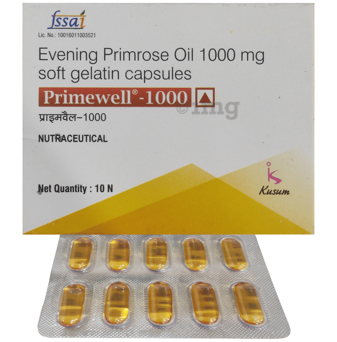 Primewell 1000mg Soft Gelatin Capsule contains Evening Primrose Oil (1000 mg) as the active ingredient and other ingredients including Food grade gelatin used in capsule shells (428), Glycerine (422), Sorbitol(420i), Soya Oil, Bees Wax (901), Antioxidant (320, 321) & Preservative (218, 216)