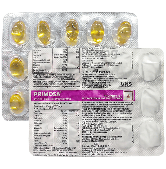 - Primosa softgel contains evening primrose oil which has omega-6 fatty acids known as gamma linolenic and linolenic acid. They support health, especially in women