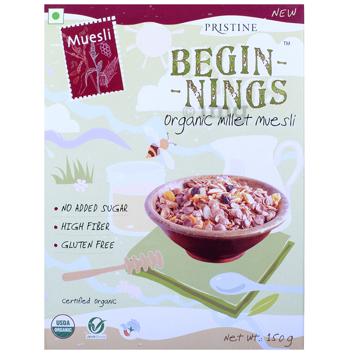 Pristine Beginnings Organic Millet Muesli is loaded with essential nutrients and is rich in dietary fibre, gluten-free, and contains no added sugar. The staple food of ancient India was millet, not rice. Millet is high in fibre, rich in essential amino acids, vitamins, and minerals, naturally gluten-free, alkaline, non-allergenic, and easily digestible.