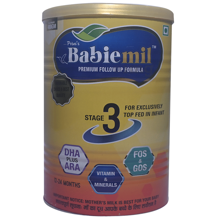 Priva's Babiemil Stage 3 Premium Follow Up Formula is a nutritional product for toddlers aged 12 to 24 months who are exclusively top-fed. As infants transition to a broader diet, this formula can help meet their evolving nutritional requirements during this critical growth phase. Rich in macronutrients like proteins, carbohydrates, and fats, it also includes a comprehensive profile of essential vitamins, minerals, omega fatty acids, and prebiotics such as FOS and GOS. This formulation contains a specialised blend of docosahexaenoic acid (DHA) and arachidonic acid (ARA), which may be valuable in supporting visual and cognitive functions. Added nutrients such as taurine and L-carnitine can support energy metabolism and overall cellular function. Babiemil Stage 3 is tailored to complement weaning diets and may help in nurturing physical and mental development in toddlers.
