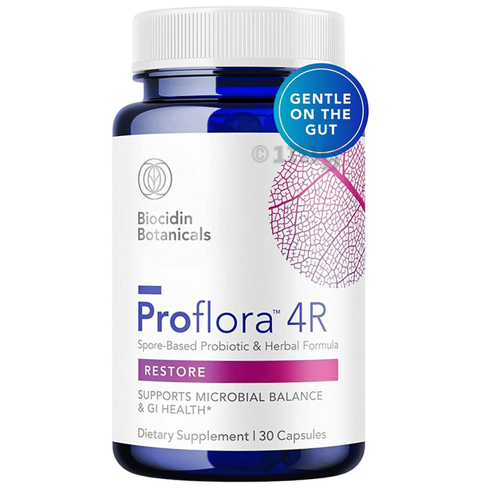 Proflora 4R Capsule is a dietary supplement formulated with a blend of herbal extracts and probiotic strains to support digestive health and gut balance. It contains a proprietary herbal blend of quercetin, marshmallow root, and aloe vera leaf gel along with a proprietary probiotic blend providing 4 billion CFU of beneficial spore-forming bacteria including Bacillus coagulans, Bacillus clausii, and Bacillus subtilis. These ingredients are commonly used to help support gastrointestinal comfort, microbial balance, and overall digestive wellness. The formulation is free from dairy, gluten, soy, corn, animal products, and artificial colouring or flavouring, making it suitable for individuals seeking a clean-label dietary supplement.