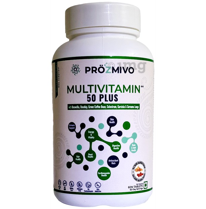 Prozmivo Multivitamin ++ 50 Plus Tablet is a combination of vitamins, minerals, and plant extracts that can help support overall health and vitality. It includes ingredients that may help maintain energy levels, support digestion, and provide antioxidant benefits.
