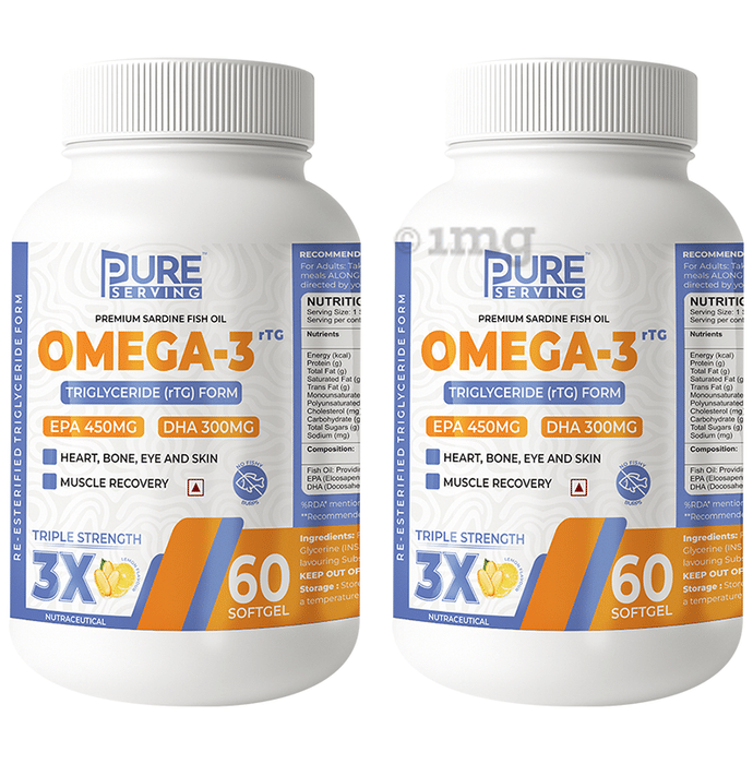 Pure Serving Triple 3X Strength softgels are a premium nutraceutical in Re-esterified Triglyceride (rTG) form for superior absorption. Each serving (2 softgels) provides EPA 450 mg and DHA 300 mg from purified sardine fish oil, and is enriched with Vitamin D3 (Cholecalciferol), Vitamin K2 (MK-7) and Vitamin E (Mixed Tocopherols). Molecularly distilled for purity and lemon-flavoured to minimize fishy aftertaste, these softgels support heart, bone, brain, eye, skin and muscle recovery — ideal for fitness enthusiasts and health-conscious users.