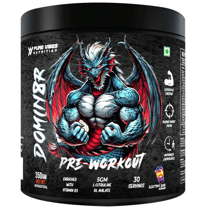 Pure Vibes Nutrition DOMIN8R Pre Workout Powder Electric Blue is a pre-workout nutritional supplement formulated to support fitness enthusiasts before intense physical activity. It is crafted to ignite energy, maintain focus, and push your endurance to the limit. Designed for gym warriors and fitness freaks alike, DOMIN8R delivers explosive energy and blood-pumping muscle pumps. It contains a blend of performance-supporting nutrients like L-Citrulline, Beta Alanine, L-Arginine, and caffeine to help provide energy and support endurance during workouts. With zero sugar and zero fat, it is available in an electric blue slush flavour and designed to be consumed before exercise.