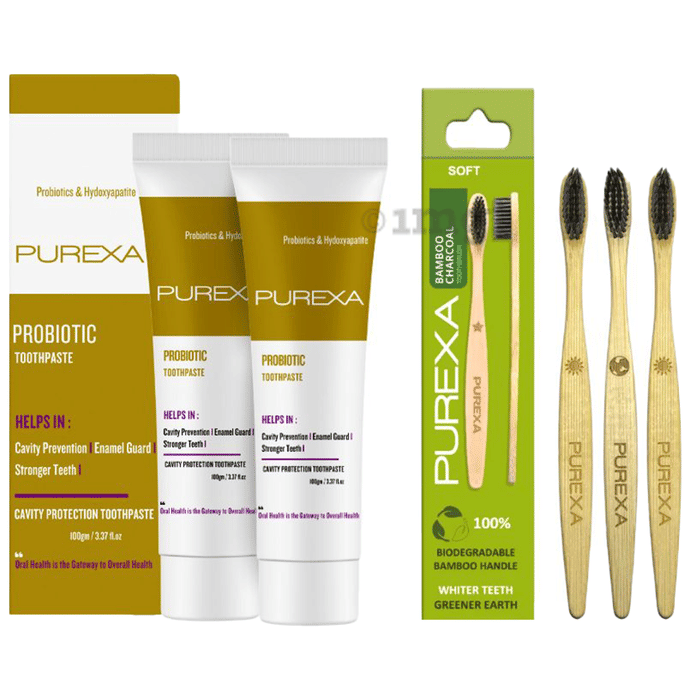 Purexa Combo Pack of 2 Probiotic Toothpaste 100gm and 3 Bamboo Charcoal Toothbrush Soft