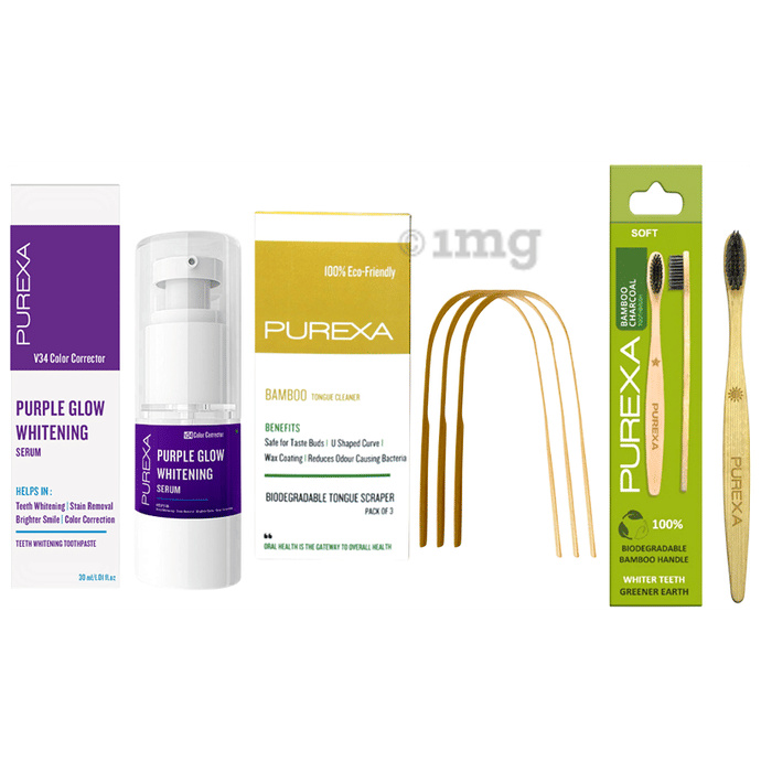 Purexa Combo Pack of Purple Glow Whitening Serum (30ml), Bamboo Tongue Cleaner (3) & Bamboo Charcoal Soft Toothbrush (1)