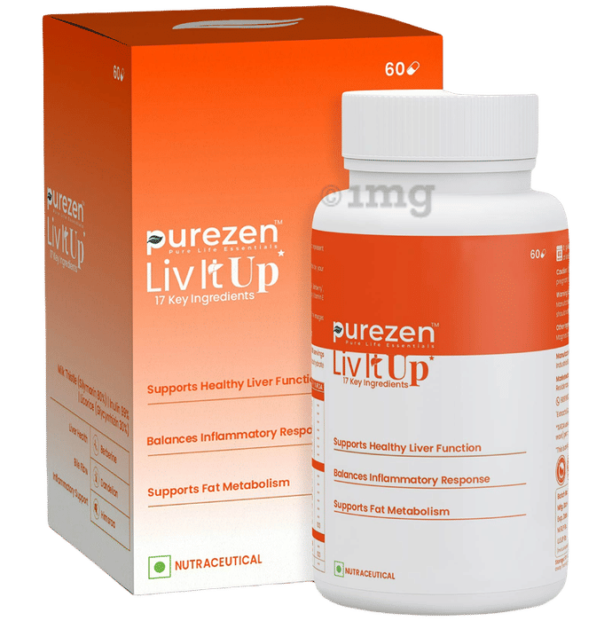 Purezen LivIt Up Capsule is a blend of 17 botanicals and nutrients formulated to support liver function, metabolic activity, and digestive balance. It combines Milk Thistle, Kalmegh, Kutki, Bhumi Amla, and Dandelion Root for liver support, while Turmeric, Amla, Triphala, and Berberry provide antioxidant protection for a healthy inflammatory response. Inulin from Chicory, Punarnava, and Arjuna contribute to digestion and fat metabolism. Piperine help enhance absorption, ensuring effective utilisation of the ingredients. Designed for modern lifestyles, it offers comprehensive daily support.
