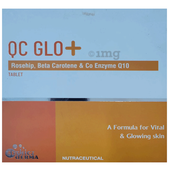 QC Glo+ Tablet is a nutraceutical formulation designed to help support glowing skin. It contains Rosehip Extract, Beta Carotene, and Coenzyme Q10, which may help maintain skin radiance and manage oxidative stress. This formula is intended for individuals looking to support their skin health and overall well-being.