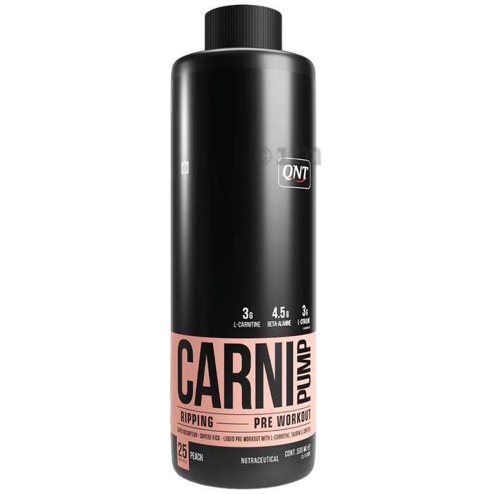 QNT Carni Pump Pre Workout Peach is a concentrated liquid formula designed to support fat loss and boost workout performance. With a blend of L-Carnitine, Beta-Alanine, L-Citrulline DL-Malate, and other active compounds, this supplement supports intense training, providing energy, stamina, and fat-burning action during exercise sessions.