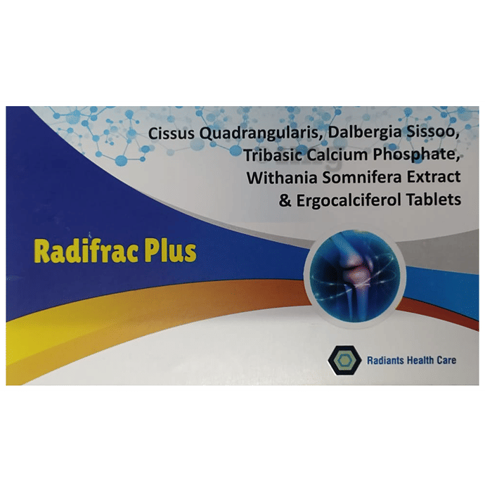 Radifrac Plus Tablet is a nutraceutical supplement formulated with Cissus quadrangularis, Dalbergia sissoo, tribasic calcium phosphate, Withania somnifera extract, and vitamin D2. It may help contribute to bone strength, joint support, and overall musculoskeletal wellness.