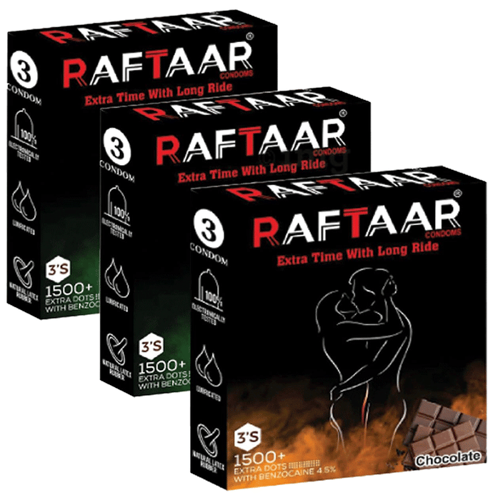 A licensed vendor partner from your nearest location will deliver Raftaar Combo Pack of Condom 2 Pcs Coolmint, 1 Pc Chocolate (3 Each). Once the pharmacy accepts your order, the details of the pharmacy will be shared with you.