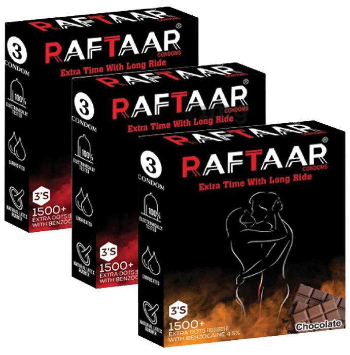 A licensed vendor partner from your nearest location will deliver Raftaar Combo Pack of Condom 2 Pcs Strawberry, 1 Pc Chocolate (3 Each). Once the pharmacy accepts your order, the details of the pharmacy will be shared with you.