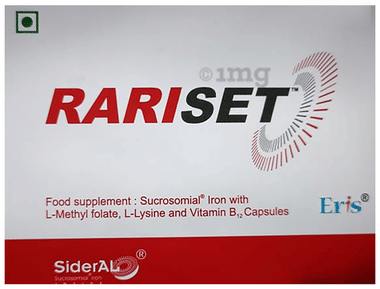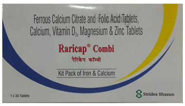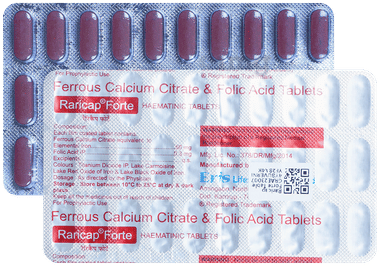 Raricap Tablet: Raricap Tablet is a dietary supplement containing iron and folic acid to support iron levels in the body. It can help increase the levels of red blood cells and aid in haemoglobin formation, which are essential for oxygen transportation from the lungs to the different parts of the body. It helps increase energy and metabolism. Key Ingredients: Ferrous Calcium Citrate equivalent to Iron, Folic Acid IP Key Benefits: