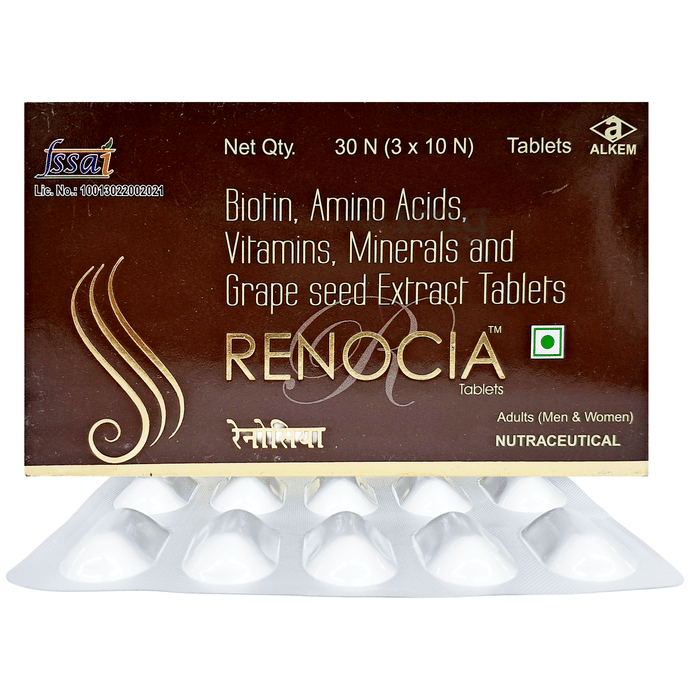 Renocia Tablet contains biotin, amino acids, vitamins, minerals and natural extracts. Renocia tablet is a multivitamin made from natural extracts to strengthen and grow hair. It works by promoting hair growth at cellular levels. It works within the scalp and may boost hair growth.