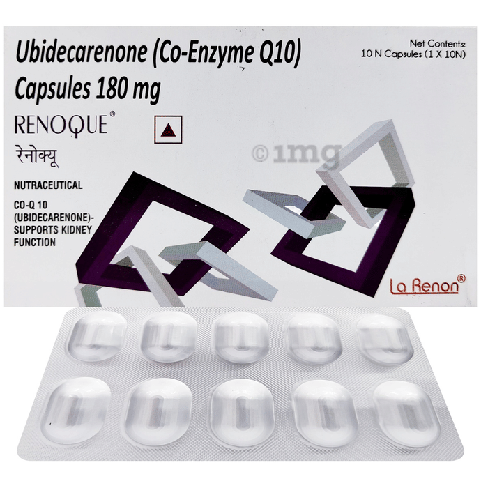 Renoque 180mg Capsule contains Ubidecarenone which is required for cellular respiration and has antioxidant properties that may help slow down signs of ageing and combat oxidative stress.
