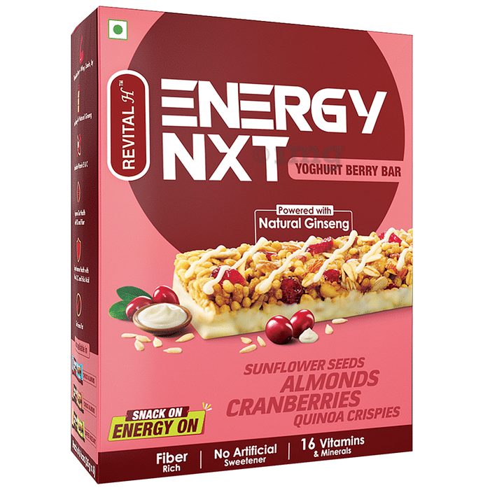 Revital H Energy NXT Bar Yoghurt Berry is India’s first protein bar that is powered with the goodness of Natural Ginseng. Now, get the energy to do more and keep raising the bar with our delicious Yoghurt Berry bar that’s packed with cranberries, quinoa crispies, almonds and sunflower seeds. It is made to give you sustained energy that keeps you going for longer. What’s more? It contains no artificial sweeteners, has zero trans fat and is packed with 16 vitamins and minerals, making it the perfect snack to have in the morning or when you get the late - noon hunger pangs. So, bite into this deliciously fruity bar and get to the NXT level.