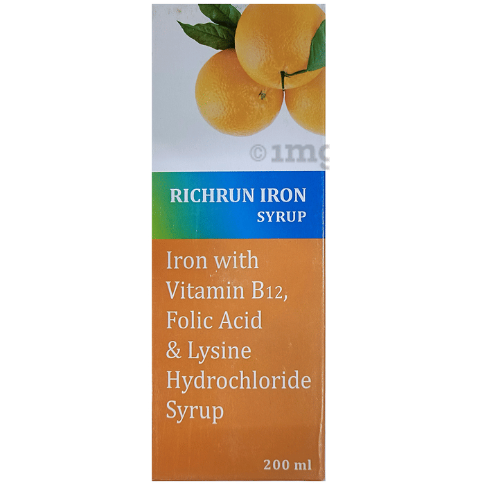 Richrun Iron Syrup is an iron supplement syrup which is rich in iron. It helps supply the iron requirement in the body. The supplement provides iron and necessary vitamins to support general health. Folic acid (vitamin B9) is crucial for DNA and amino acid synthesis, supporting cell division and blood cell growth. Vitamin B12 is essential for red blood cell development, and DNA synthesis, and may help in protein, fat metabolism, and hormone function. Iron is important for haemoglobin production, oxygen transport, immunity, hormone development, and body temperature regulation.