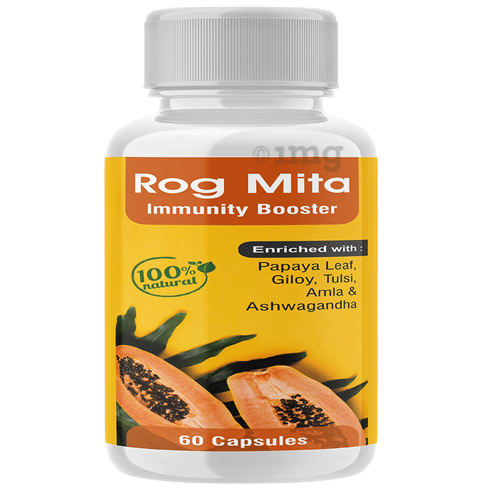 Rog Mita Immunity Booster Capsule (60 Each) is an Ayurvedic proprietary formula, enriched with 100% natural ingredients like Papaya Leaf, Giloy, Tulsi, Amla, and Ashwagandha. This powerful blend of herbs supports overall health and wellness. Available in a 60-capsule pack, it is recommended for individuals seeking to support their immune health naturally.
