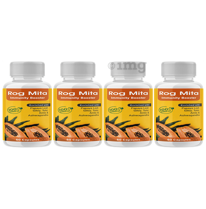 Rog Mita Immunity Booster Capsule (60 Each) is an Ayurvedic proprietary formula, enriched with 100% natural ingredients like Papaya Leaf, Giloy, Tulsi, Amla, and Ashwagandha. This powerful blend of herbs supports overall health and wellness. Available in a 60-capsule pack, it is recommended for individuals seeking to support their immune health naturally.