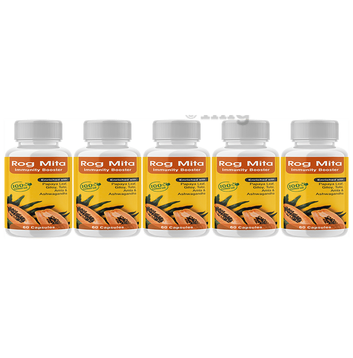 Rog Mita Immunity Booster Capsule (60 Each) is an Ayurvedic proprietary formula, enriched with 100% natural ingredients like Papaya Leaf, Giloy, Tulsi, Amla, and Ashwagandha. This powerful blend of herbs supports overall health and wellness. Available in a 60-capsule pack, it is recommended for individuals seeking to support their immune health naturally.