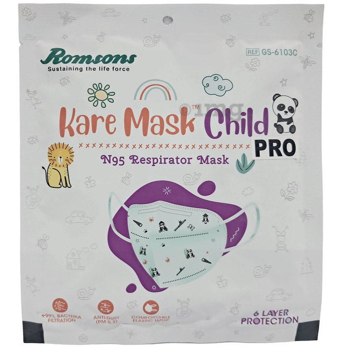 Romsons Kare Mask Child N95 Respirator Kids Mask is a kids mask designed to support safety and comfort for young users. This kids mask filters airborne particles, bacteria, and dust effectively, making it suitable for outdoor activities or crowded spaces. The lightweight design and elastic ear loops ensure prolonged comfort and secure wear, while the child-friendly design encourages regular use.