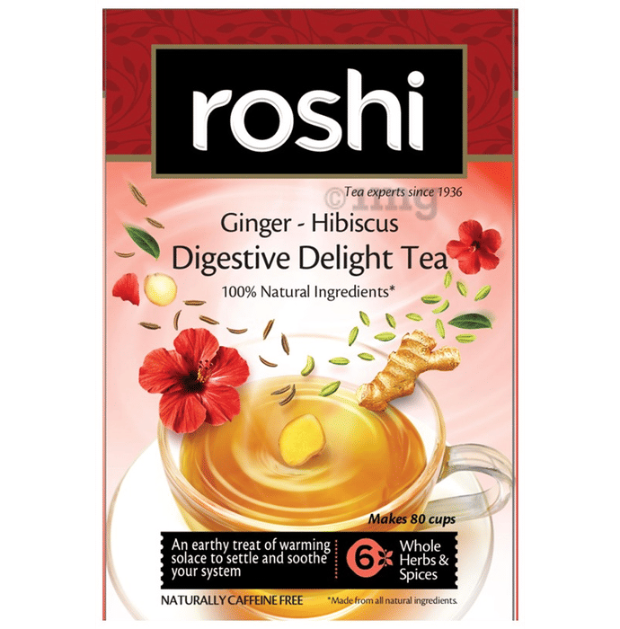 Roshi Ginger-Hibiscus Digestive Delight Herbal Tea is a healthy blend of 100% natural ayurvedic herbs, spices and green tea that make it a perfect cup of masala chai. It boosts the immunity of the body and provides several other benefits. The many benefits include helping with rehydration, detoxification of the body, improving the health and vitality of the skin and the hair and helping with heartburn and indigestion issues. As an added benefit, it is naturally caffeine-free.