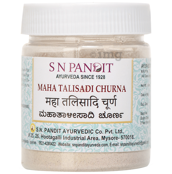 S N Pandit Ayurveda Maha Talisadi Churna is an ayurvedic product combination of many herbs in dry powder. It is indicated in respiratory and digestive conditions. The combination acts on mucus and helps clear it by liquifying it.