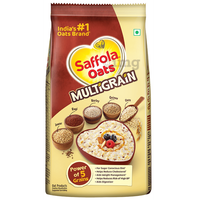 Saffola Oats Multigrain is a wholesome blend of five grains—oats, jowar, barley, ragi, and quinoa—crafted to offer a balanced and satisfying meal option. With a mix of wholegrain flakes and the added goodness of flax seeds, it brings together fibre, plant-based protein, and essential micronutrients in every serving. Its mild flavour pairs well with both sweet and savoury preparations, making it versatile for daily use. The combination of multigrain flakes helps support digestive comfort, steady fullness, and everyday nourishment without added sugar or salt. Ready in just 4 minutes, it provides a convenient breakfast or snack choice for those who prefer a simple, nutrient-supportive option as part of their daily routine.