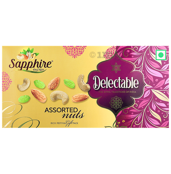Sapphire Dry Nuts Delectable Gift Pack 300gm offers a premium selection of almonds, cashews, and raisins. Perfect for gifting or enjoying as a snack, these nuts are packed in a protective atmosphere to preserve freshness. The assorted nuts provide a healthy and tasty option for those looking for a nutrient-rich snack, with essential fats, proteins, and fibre to support overall wellness.