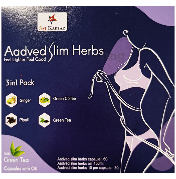 Sat Kartar Aadved Slim Herbs Feel Lighter Feel Good 3 in 1 Kit is a three-part Ayurvedic proprietary formulation that includes oral capsules, massage oil, and 10 PM capsules for structured day and night support. The capsules combine green coffee, green tea, ginger, and pipali to help support internal cleansing and balance. The topical oil formulation includes ajwain, tejpatra, and mustard oil that may assist with external stimulation when applied regularly. The 10 PM night capsules contain fruits such as harad, bahera, and amla, which are associated with rejuvenative support. This combination may be suitable for individuals following a holistic regimen aimed at maintaining vitality and overall wellness.