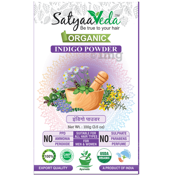 - SatyaaVeda’s Organic Indigo Powder naturally colors hair with a violet/blackish hue