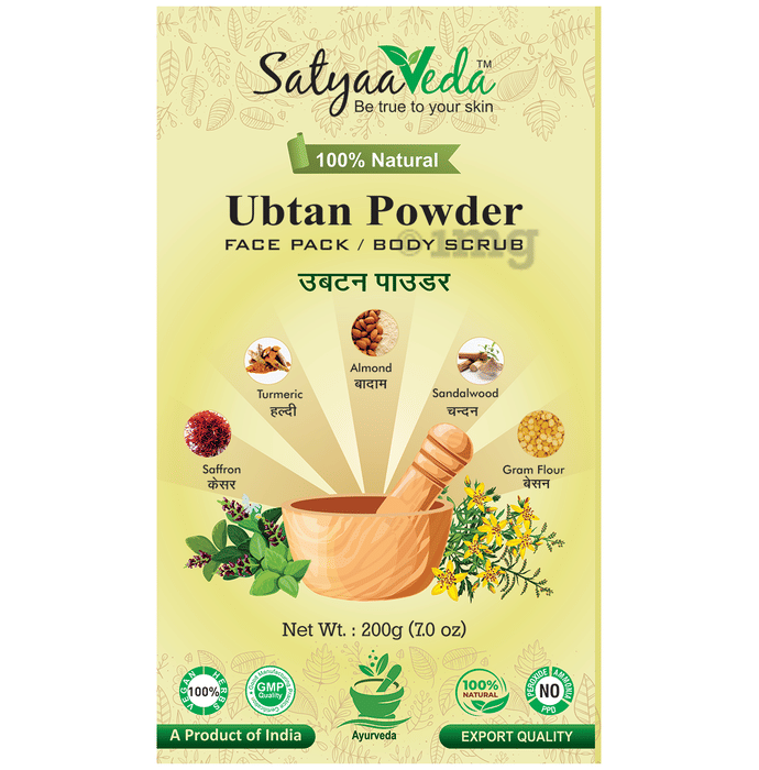 SatyaaVeda Ubtan Powder is a natural face pack and body scrub crafted with saffron, turmeric, gram flour, sandalwood, and almonds. This blend can help maintain soft and supple skin while supporting a refreshed appearance. The formulation can help clear away surface impurities, even out the complexion, and provide gentle exfoliation for a smoother texture. Regular use can help nourish the skin with essential natural components, leaving it looking healthier and well-balanced.