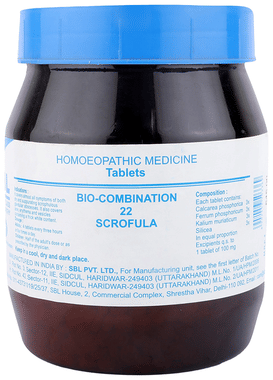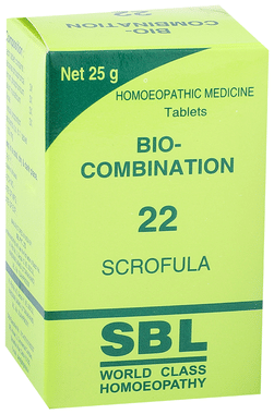 SBL Bio-Combination 22 Tablet is a homoeopathic remedy which has various health benefits. It is recommended for treating ailments related to scrophulous glandular abscesses. It is also useful in treating skin related disorder such as acne, erythema and vesicles containing a thick white content. Based on the homoeopathic formulation, it is safe to use.