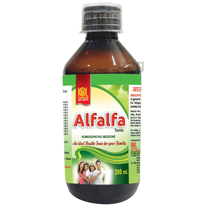 Sett Dey Alfalfa Tonic Sett Dey Alfalfa Tonic is a general body-building tonic that supports body nourishment and vitality. Key Ingredients: Alfalfa Q 0.25ml H.P.I,Avena Sativa Q 0.15ml H.P.I,Withania Somnifera Q 0.10ml H.P.I,Hydrastis Canadensis Q 0.10ml H.P.I,Cinchona Officinalis Q 0.05ml H.P.I,Ginseng Q 0.05ml H.P.I,Damiana Q 0.05ml H.P.I,Passiflora Incarnata Q 0.05ml H.P.I,Natrum Phosphoricum 3X 25mg H.P.I,Calcarea Phosphorica 3X 25mg H.P.I,Kali Phosphoricum 3X 25mg H.P.I,Ferrum Phosphoricum 3X 10mg H.P.I,Syrup 1.5ml H.P.I,Colourcaramel 0.05 Ml,Flavour : Vanilla 0.0125 Ml,Purified Water Q.S. H.P.I,Alcohol Content 11.65 % v/v Key Benefits: